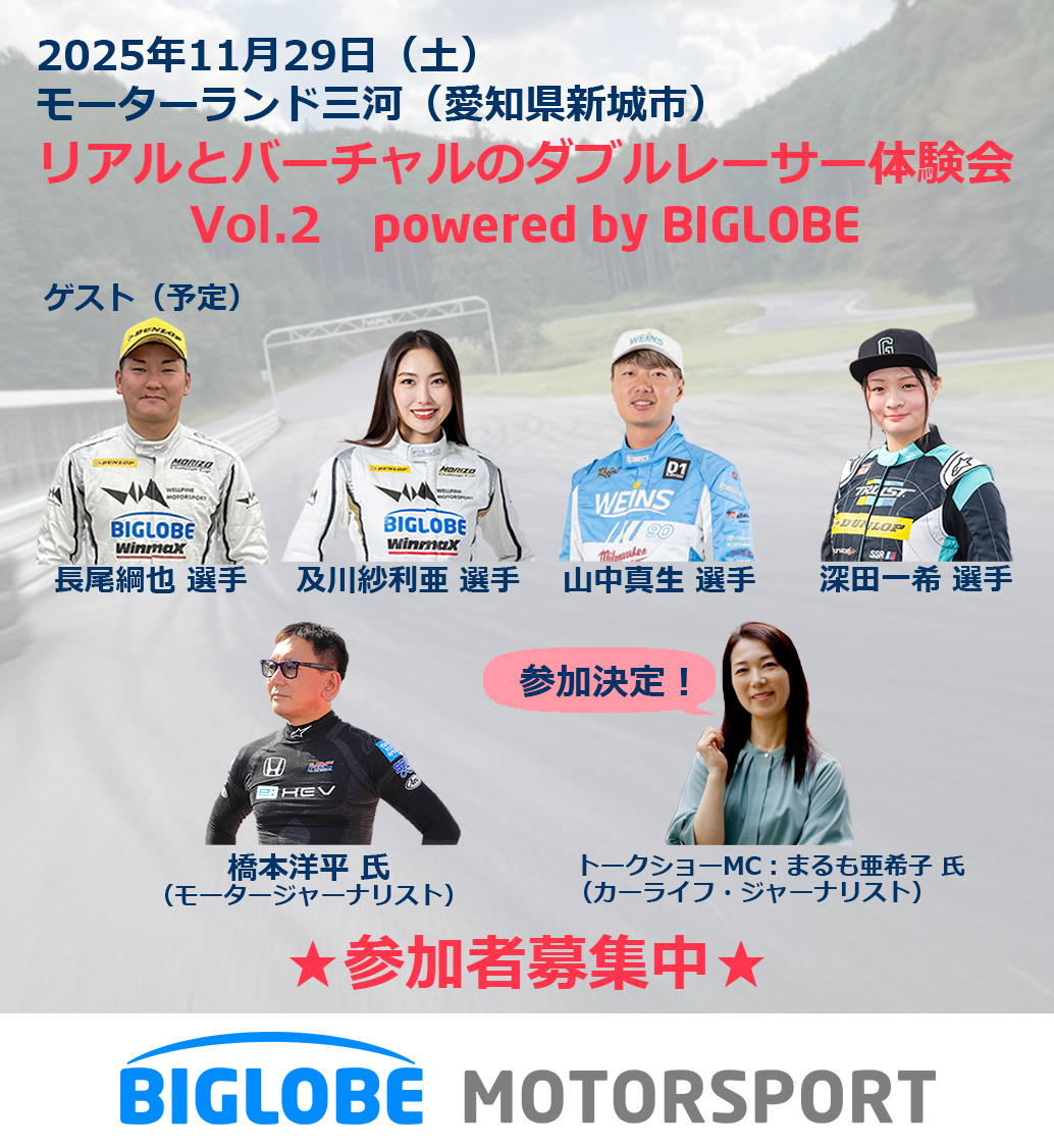 ビッグローブ株式会社(以下、BIGLOBE)は、株式会社ウィンズアゲイン(以下、WinsAgain)との共催で2025年11月29日(土)にモーターランド三河(愛知県新城市)において、リアルとバーチャルのレース体験を同時にできるイベント「リアルとバーチャルのダブルレーサー体験会 Vol.2 powered by BIGLOBE」を開催します。
