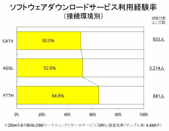 今回のSOFTPLAZA大賞の発表に先立って実施したBIGLOBEのマーケティングリサーチサービス「DR1」の調査結果では、接続速度が高速になるに従ってダウンロード購入経験者の割合は高まっており、特にFTTHを利用しているユーザにおいては購入経験率が64.6%と、3人に2人の割合で利用されております(2004年9月実施のFTTH・ADSL・CATV接続を利用するDR1モニター4,888人を対象とした調査結果、次ページにグラフを表記)。 ※DR1モニターはBIGLOBE以外のISPサービス利用者も含みます。 |