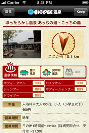 GPSによる位置情報を活用した周辺の日帰り温泉施設検索が可能。現在地からの距離や方角が直感的に把握できるほか、施設の写真と口コミ投稿を元にした評判情報が5ツ星で表示されるため、検索結果が多い場合でも絞り込みが容易。個別の施設をタップすると、施設名、現在地からの距離(Km)、料金、口コミ情報などの詳細情報を表示する。GPSを使用せず、都道府県・地域から検索することも可能。