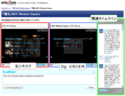 NECが提供する「Wisdom」内の特設サイトにおいて、「生シネスク」および「Dig」に関するツイッターのタイムラインを1本に統合して掲載するほか、双方のユーストリーム配信画面も1画面上で提供。これにより、「Dig」と「生シネスク」の異なるジャンルの視聴者・リスナーが、ひとつのタイムライン上で、コミュニケーションしながら楽しむことが可能になる。