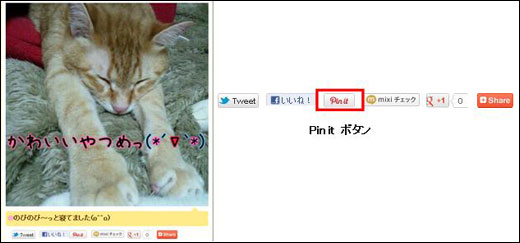 また、「ペットスマイル」アプリでは、Tweet、Facebookのいいね!などに加え、「Pinterest」に登録している利用者向けに、「ペットスマイル」と「Pinterest」に同時に写真を投稿するための「Pin it」ボタンを追加しました。