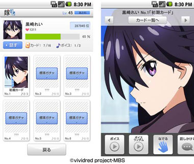 「嫁コレ」は、アニメやゲーム作品に登場する「嫁にしたい」キャラクターのカードをコレクションして楽しむアプリで、キャラクター画像や、声優による録り下ろしボイスを収録しています。カードを表示した画面上で、“なでる” “キスする” “プレゼント” “起こしてもらう(目覚まし)”などの操作をすることで、キャラクターの“愛情度”が向上し、“愛情度”に応じて、ボイスの数や、「嫁」として選べるキャラクターの上限数が増えていきます。本アプリのダウンロードと、1キャラクターあたり2枚のカードは無料で、さらに有料でカードを購入することも可能です。