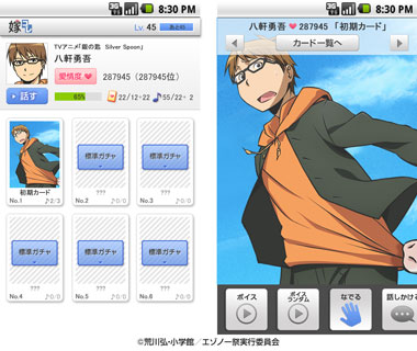 BIGLOBEは3月4日より、アニメやゲームキャラクターの録り下ろしボイスが聴けるカードコレクションアプリ「嫁コレ」(iPhone及びAndroid(TM)向け)(注1)にTVアニメ『幻影ヲ駆ケル太陽』の“太陽あかり”と、TVアニメ『銀の匙 Silver Spoon』の“八軒勇吾”を追加します。今回の追加によって、「嫁コレ」アプリで遊べるキャラクターは、120作品、357キャラクターと、声優18人となります。