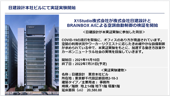 X1Studioは、株式会社日建設計と共同で進めている「クラウドプラットフォームを活用したセンサー・設備制御ネットワークシステムの協創」の取り組みの中で、BRAINBOXAIによる空調制御の実証実験を11月10日に開始しました。将来的には、本協創で取得している様々なセンサーデータを活用し、BRAINBOX AIによる制御の更なる高度化も試行していきます。